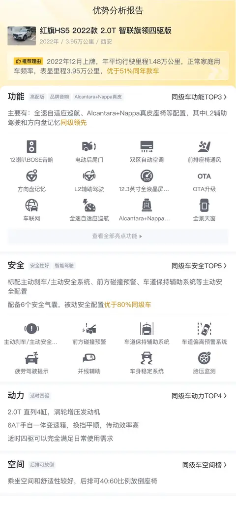 这辆红旗HS5 2022款 2.0T 智联旗领四驱版从价格和配置方面来看,性价比还是不错的,毕竟不到13万的价格就能拿下这么一辆四驱中型SUV,还是挺合适的。不过这车开的不多,两年多的时间,只开了不到4万公里,平均一年不到2万公里,再加上过户过一次,可能会影响潜在买家的购买意愿。但话说回来,这个价格也挺合适的了,感兴趣的朋友可以线下看看。