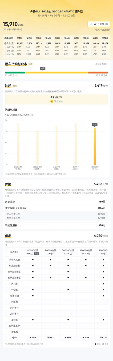 除了价格,我们还要考虑这款车的用车成本。据估算,这款车的年均综合用车成本约为1.6万元。当然,这个数字还会根据您的实际使用情况和当地的消费水平有所变动。接下来,我们再来看看这款车的10年用车成本。