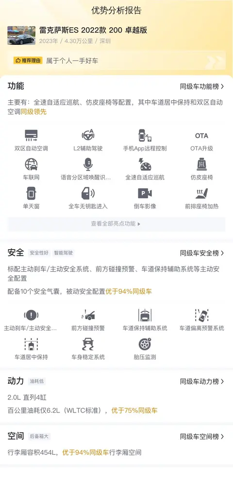 优势:雷克萨斯ES 2022款 200 卓越版的市场行情价是19.18万-23.18万,它的报价则是19.38万,报价偏低,还是最近一年的新车,基本没有折损。性能稳定,配置丰富,尤其是安全性,配置了10个安全气囊。使用成本不高,保值率还高。