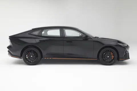 来到车身侧面,溜背式设计得以延续,从车顶一直延伸到车尾,线条流畅自然,就像一道优美的弧线。上翘的立体腰线从车头一直贯穿到车尾,让车身看起来更有力量感。半隐藏式门把手在车辆解锁时会自动弹出,锁车后又会自动收回,既降低了风阻,又增加了科技感。19英寸熏黑轮毂造型独特,就像运动健将的跑鞋一样,充满了力量,搭配上橙色刹车卡钳,运动气息更加浓郁。悬浮式车顶的设计让车身看起来更加轻盈,组合在一起,营造出一种蓄势待发的运动姿态,就好像随时准备冲出去和别的车来一场速度与激情的较量。车身尺寸方面,新车长宽高分别为4740/1838/1430mm,轴距达2750mm,相比上一代车型,车长增加了不少,车内空间也就更宽敞了,这对于既要运动感又要实用性的消费者来说,简直太友好了,后排坐三个成年人也不会觉得拥挤,后备箱空间也足够日常使用,放几个行李箱或者运动器材都没问题。