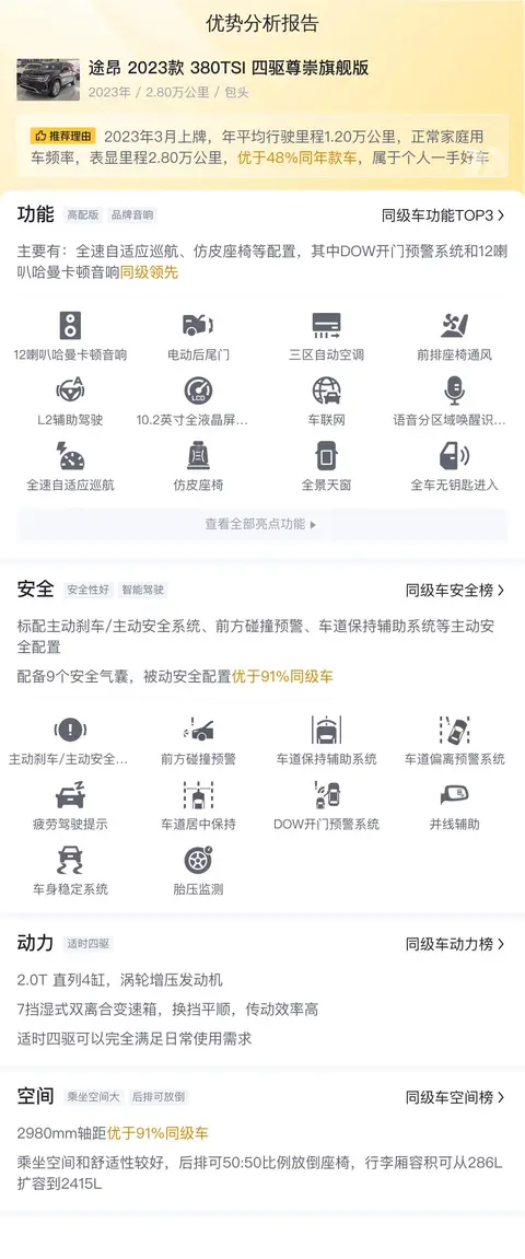 综上所述,就是我们对这辆途昂 2023款 380TSI 四驱尊崇旗舰版的全部介绍,希望可以帮助您更加直观的了解一下这款车,当然,二手车一车一况,一况一价,想要了解更多,还请您亲自前去体验试车。