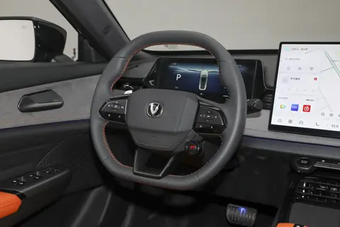 再来看一下车内部分。第三代长安UNI-V虽然是燃油车,但整体风格还是有些偏向于现在的大多数新能源车型,整体风格比较简约时尚,尤其是黑橙搭配的内饰配色看起来十分有活力,坐进车内就能激发人的驾驶欲望。14.6英寸的中控大屏采用的是悬浮式设计,加上10.25英寸的全液晶仪表,将车内的主要信息囊括其中。中控屏的显示效果清晰细腻,操作流畅,支持多种应用程序,而全液晶仪表盘则提供了丰富的行车信息,界面设计简洁直观,驾驶者可以一目了然地掌握车辆状态。