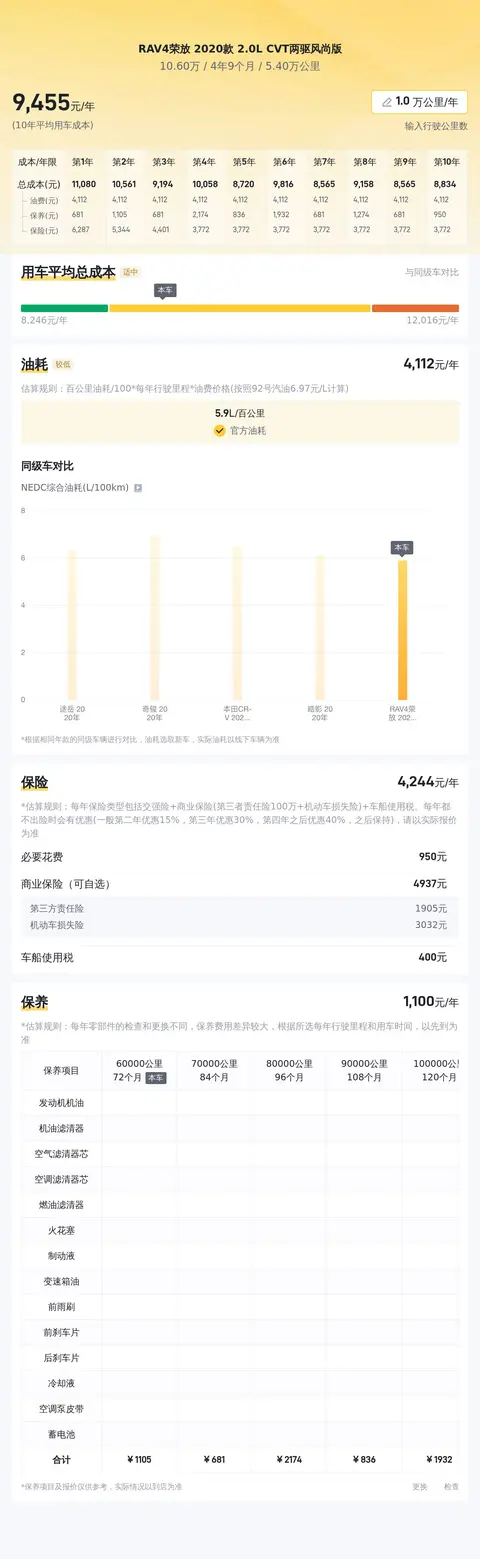 此外,根据估算,这辆车的用车成本较低,因为它的年均综合用车成本大约为每年1.1万元左右。当然,实际费用支出可能会因使用频率、环境条件等因素而有所变动。