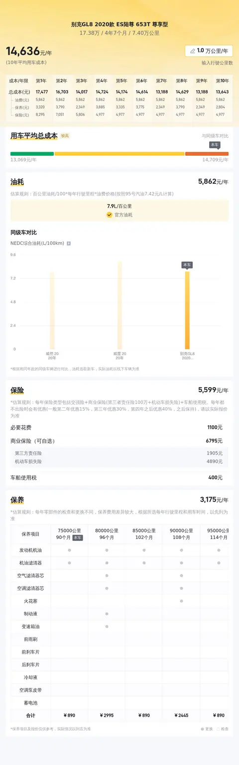 在用车成本方面,懂车帝对这款车的分析显示,其10年平均用车成本约为15153元/年,这一成本在同类车型中处于较高水准。这主要是由于该车型的保修养护项目较多,且使用了95号汽油,因此在燃油费用和保养费用上相对较高。然而,考虑到别克GL8 ES陆尊 653T 舒适型的车身尺寸、动力性能以及乘坐人数等因素,这样的用车成本仍在合理范围内。车主反馈显示,该车的空间表现和舒适性得到了大多数用户的认可,尤其是对于家庭用车或商务接待来说,其宽敞的内部空间和舒适的乘坐体验带来了较高的满意度。同时,也有部分车主提到了用车成本的问题,特别是燃油费用和保养费用,他们认为相对于其他同类车型来说,这款车的用车成本确实偏高。综合来看,别克GL8 2020款 ES陆尊 653T 舒适型在用车成本方面的表现并非尽善尽美,但在其他方面如空间、舒适性和动力性能等方面的表现仍然使其成为一款值得考虑的车型。