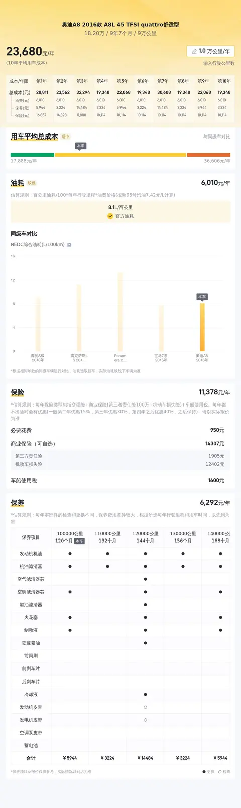 市场行情显示,这款车型的二手车价格大约在18.78万到23.21万元之间。但需要注意的是,具体的售价会受到车辆状况等因素的影响,实际成交价需根据车辆具体情况确定。关于用车成本方面,该车型的百公里油耗为8.1升,按照一年行驶2万公里计算,燃油费用约为1.46万元。此外,保险费用每年约1.17万元,保养费用每年约8033元。这些成本总计每年约为2.51万元。请注意,这些数据仅供参考,实际费用可能会根据油价、行驶里程、保养质量等因素有所变动。