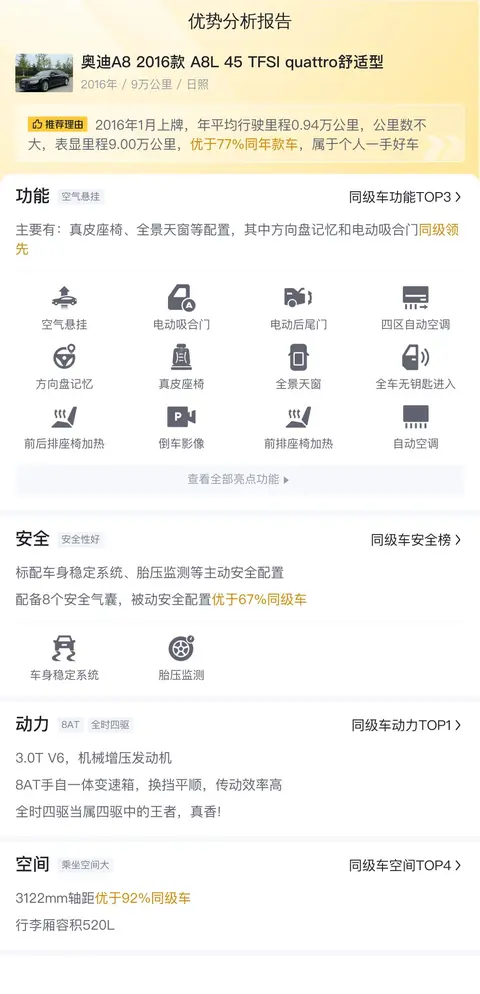 综上所述的新车含税价、用车成本、市场行情、优势分析、同款比价等数据仅供参考。在配置部分,因为二手车非标品,车辆可能会存在配置改装的情况,具体车况信息需要线下结合车辆实际情况进行综合参考。