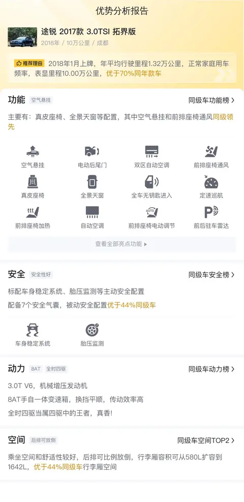 综上所述的新车含税价、用车成本、市场行情、优势分析、同款比价等数据仅供参考。在配置部分,因为二手车非标品,车辆可能会存在配置改装的情况,具体车况信息需要线下结合车辆实际情况进行综合参考。