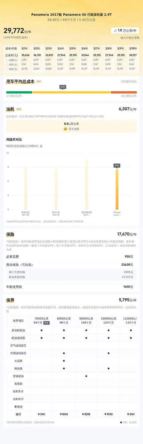 Panamera 2017款 Panamera 4S 行政加长版 2.9T的市场行情价是65.78万-80.21万,它的报价则是69.80万,报价在市场行情中偏低,同时它的保值率也高于同级车,因为它的热度一直很高,所以价格一直很坚挺。根据估算,同级车的最低用车成本是17970元/年,最高是43940元/年,Panamera 2017款 Panamera 4S 行政加长版 2.9T是33090元/年,用车成本适中,不过豪车的用车成本都不会太低,这个需要做好心理准备。