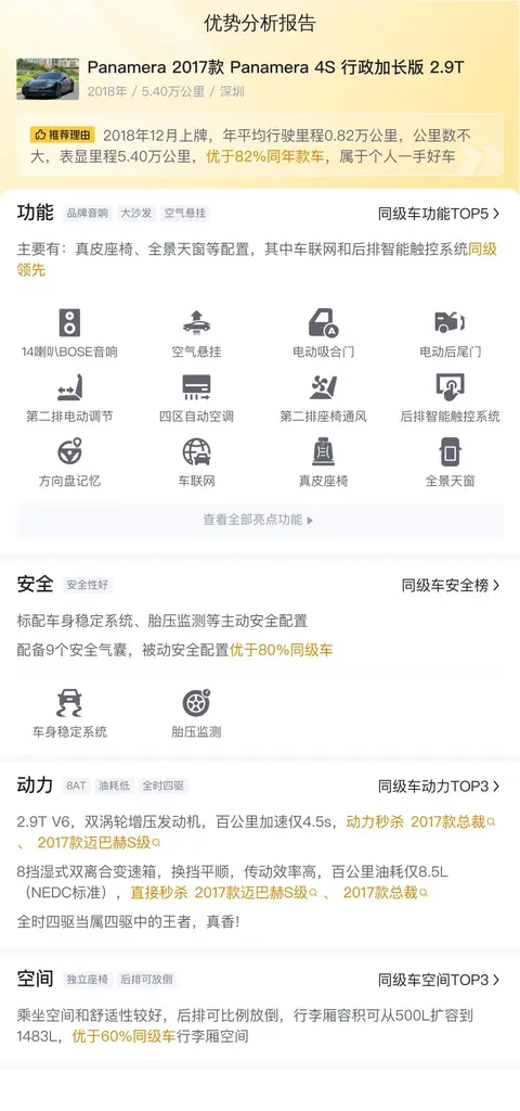 综上所述的用车成本、市场行情、优势分析、同款比价等数据仅供参考,车况信息需要线下结合车辆实际情况进行综合参考,这辆帕拉梅拉让我想到了网上很火的那个段子:开宝马 奔驰的是有钱人,开兰博基尼 法拉利的是富人,开帕拉梅拉的是狠人,兄弟们,做人做事,别忘了,咱也是狠人!现在机会来了,7年5万公里,只要69.8万的帕拉梅拉行政加长版,3秒俱乐部会员卡等你来拿!