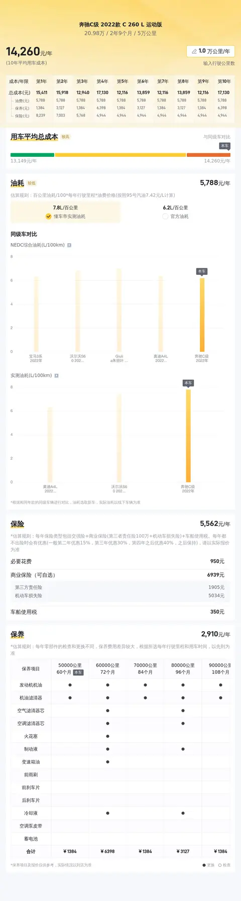 基于懂车帝对奔驰C级 2022款 C 260 L 运动版的分析,该车6年平均用车成本约为14160元/年,与同级车相比处于较高位置。保险费用预估为5838元/年,同样偏高。然而,得益于其百公里油耗6.3L的优良表现,燃油费用得以控制在5050元/年,这一数据优于42%的同级车型。在保养方面,每年的费用大约为1271元,这一数字高于同级车平均水平。考虑到奔驰品牌的高端定位,这一保养成本可以说是合理且必要的。