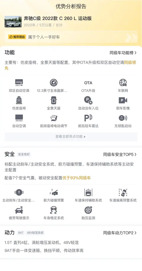 综上所述,这辆奔驰C级 2022款 C 260 L 运动版在二手车市场上以其原版原漆的车况、全面通过的事故检测、合理的售价、先进的技术和配置,以及相对较低的油耗,展现出了极高的购买价值。无论是从安全性、舒适性还是经济性来看,它都表现出了奔驰品牌的精湛工艺和技术实力。如果你正在寻找一辆高品质的二手车,那么这辆奔驰C级无疑是一个值得考虑的选择。