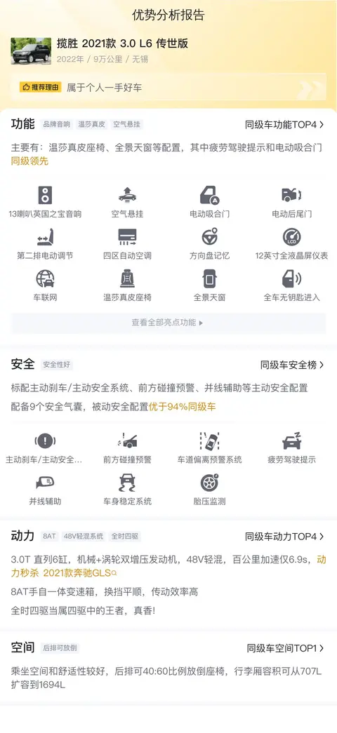 综上所述的新车含税价、用车成本、市场行情、优势分析、同款比价等数据仅供参考。在配置部分,因为二手车非标品,车辆可能会存在配置改装的情况,具体车况信息需要线下结合车辆实际情况进行综合参考。
