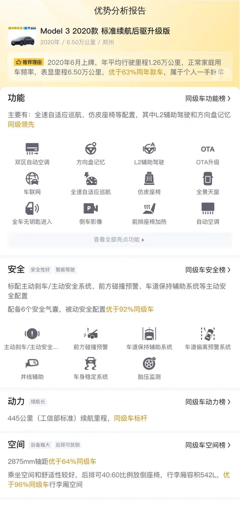 特斯拉作为电动汽车领域的先锋企业,凭借其革命性创新和卓越的性能,成为了全球电动汽车市场的领导者之一。特斯拉Model 3(图片|配置|询价)作为特斯拉旗下的一款重要车型,在全球电动汽车市场中占据了重要地位,并且在多个地区成为最畅销的电动汽车车型。尽管市场上存在众多竞争对手,特斯拉Model 3凭借出色的性能、较长的续航里程和合理的价格,仍然能够吸引大量消费者的眼球。这辆Model 3 2020款 标准续航后驱升级版,是2020年的车型了,跑了6.5万公里,报价10.9万,属于比较低的报价了。