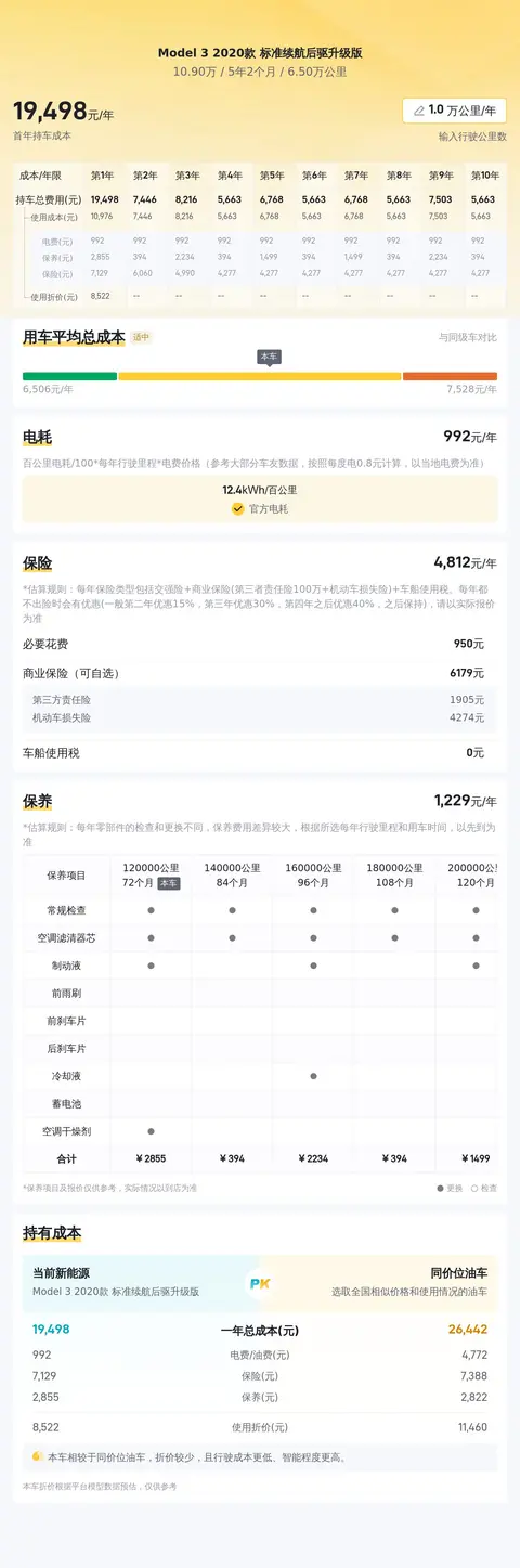Model 3 2020款 标准续航后驱升级版是一款纯电动车型,日常用车成本较低,据估算,该车的10年平均用车成本约为19083元/年,相较于同价位油车,用车成本较低。