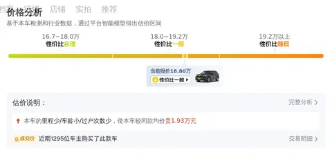 根据大数据预估显示,这辆车的市场价格在17.08万至20.57万之间。具体的价格因车辆的车龄、里程、过户次数等因素而异。该车的里程少于均值5.1万公里,车龄少于均值0.3年,过户次数少于均值0.4次,这些因素都使得该车的价格相对较高。而在用车成本方面,根据数据显示,这辆车的年均综合用车成本约为1.3万元,这一成本在同级别车型中处于适中的水平。