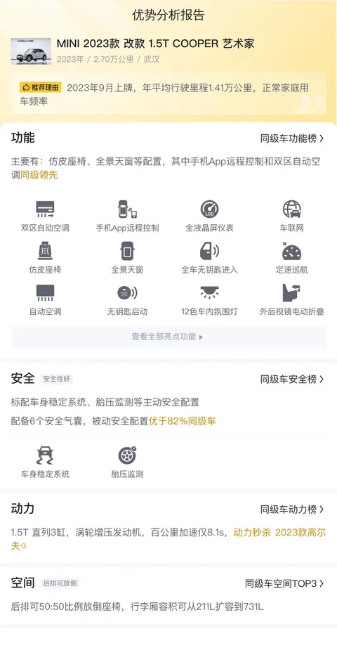 这辆二手MINI和2023款大众Polo相比,在配置上有自己的特色和优势。它配备了仿皮座椅、全景天窗等配置,其中手机App远程控制和双区自动空调更是同级领先。这些配置不仅提升了驾乘的舒适度,还增加了车辆的科技感。动力方面,它搭载了1.5T直列3缸涡轮增压发动机,百公里加速仅8.1s,相比同级车动力表现优秀,且优于2023款大众Polo。空间方面,后排座椅可50:50比例放倒,行李厢容积可从211L扩容到731L,提供了灵活多变的储物空间。总体而言,这辆MINI在配置、动力、空间等方面均表现出色,且在手机App远程控制和双区自动空调方面独具特色,展现了其作为高端小型车的独特魅力。