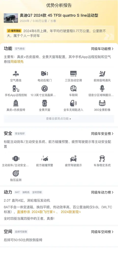 接下来,我们来分析一下这辆车的性价比。性价比是指车辆的性能、配置、品质等方面与价格之间的关系。如果一辆车的性能出色、配置丰富、品质可靠,而价格又相对较低,那么我们可以说这辆车的性价比很高。反之,则性价比较低。考虑到这辆车的车龄较新(预计再行驶2年后车龄为2年)、里程适中(0.9万公里)以及零过户次数等因素,我们可以得出结论:这辆奥迪Q7 2024款 45 TFSI quattro S line运动型的性价比相当不错。它在保持较高市场售价的同时,也为购买者提供了一个相对经济实惠的选择。