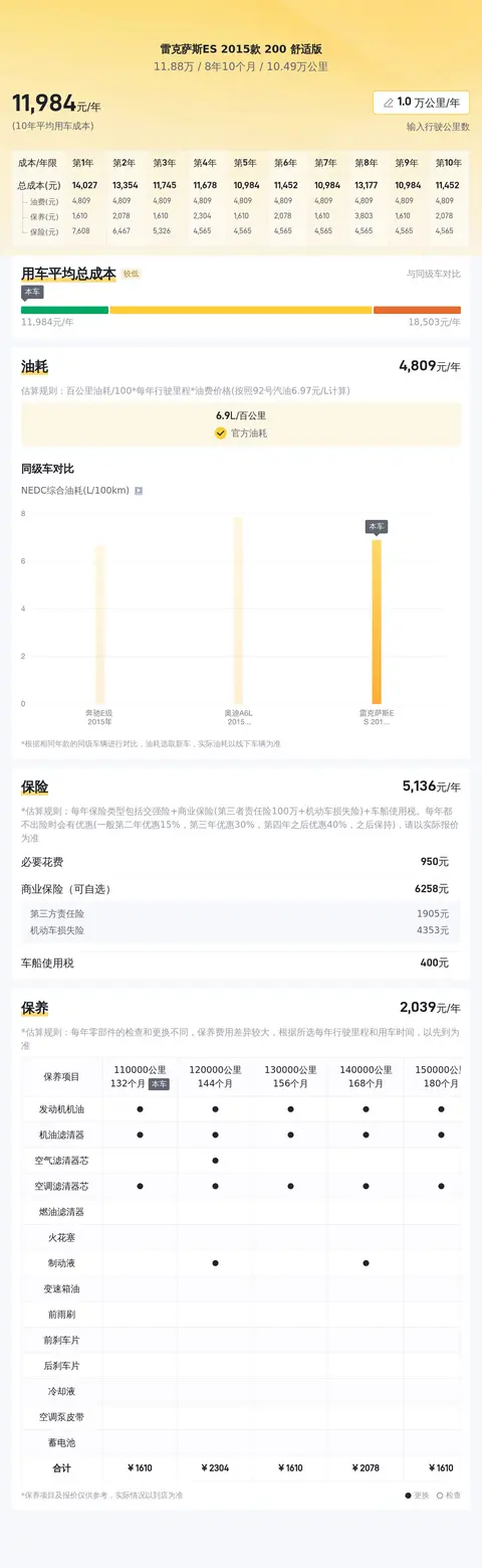 雷克萨斯ES 2015款 200 舒适版的10年平均用车成本大约在1.2万元/年,具体费用开销视个人使用习惯及养护程度而定。