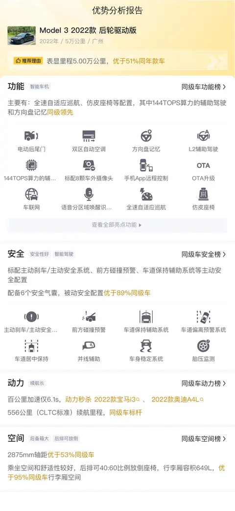 根据大数据预估显示,这辆车的售价在13.27万至15.82万之间,具体售价因车况而有所不同。作为一款中型纯电动轿车,Model 3在空间、动力、配置等方面都有着不错的表现。车内乘坐空间宽敞,后备厢容积也足够日常使用。在续航方面,Model 3拥有较长的续航里程,能够满足大多数人的日常通勤需求。在动力方面,Model 3拥有出色的动力输出和加速性能,能够为驾驶者带来极致的驾驶体验。在配置方面,Model 3配备了多种智能科技配置,让驾驶更加便捷。