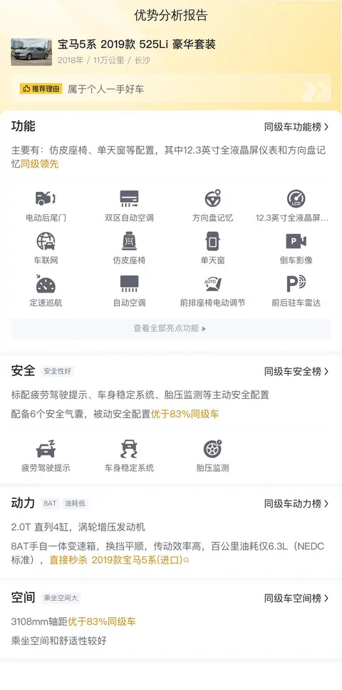 另外,根据估算,同级车的最低用车成本是13463元/年,最高是18370元/年,宝马5系 2019款 525Li豪华套装是14183元/年,用车成本较低。
