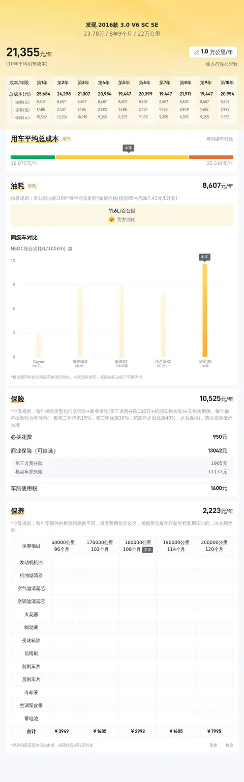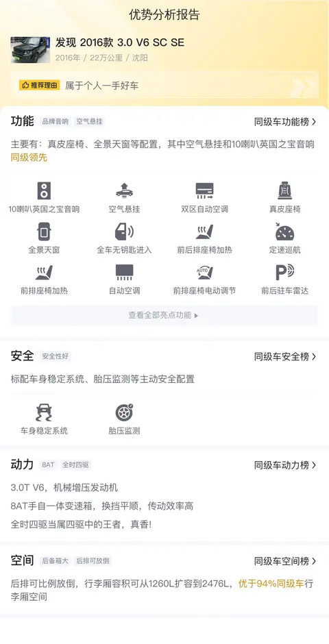 目前该车的二手车市场行情大约在21.62万至27.27万之间,具体售价要看车辆的车况、行驶里程、上牌年限等情况而定。这辆车的售价23.78万,车况正常情况下,价格属于正常水平。该车6年10个月,里程22万公里,车龄超出同类车平均值,里程超出同类车平均值,未出过事故,过户次数0次,综合性价比指数72%,是一个正常的水平。这款车在发现系列中属于早期车型,在此之后还有2017款、2020款、2023款,追求性价比的用户,可以选择二手路虎发现,追求新技术和新体验的用户,可以考虑新款车型。