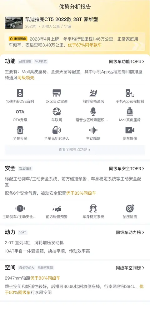 该车优点是配置丰富,尤其是座椅通风和手机APP远控在同级别车型中领先,动力强劲,后驱形式能带来不错的操控乐趣,车身尺寸大,乘坐舒适性好。缺点是凯迪拉克品牌力一般,保值率不高,可能再转手时会受到一定影响。