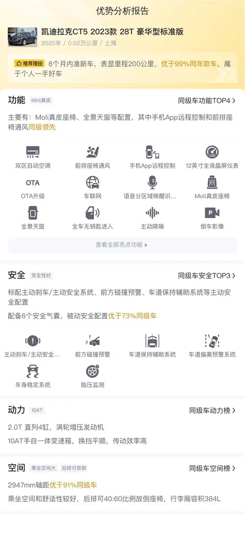 综上所述的新车含税价、用车成本、市场行情、优势分析、同款比价等数据仅供参考。在配置部分,因为二手车非标品,车辆可能会存在配置改装的情况,具体车况信息需要线下结合车辆实际情况进行综合参考。