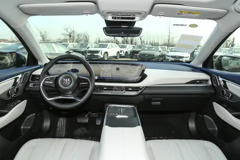 别克君越中控台上方大面积蓝色皮质包裹,往下又是大面积白色皮质包裹搭配30英寸的中控大屏,其中就包含了全液晶仪表和中控大屏,方向盘则采用真皮包裹的多功能方向盘,这套方向盘的握感还是很细腻的,换挡机构则采用电子式怀挡设计,中央扶手则有双手机无线充电,不仅如此这台车还有121色车内氛围灯以及11个BOSE音响,这套内饰无论是用料还是配置给的都比较丰富。