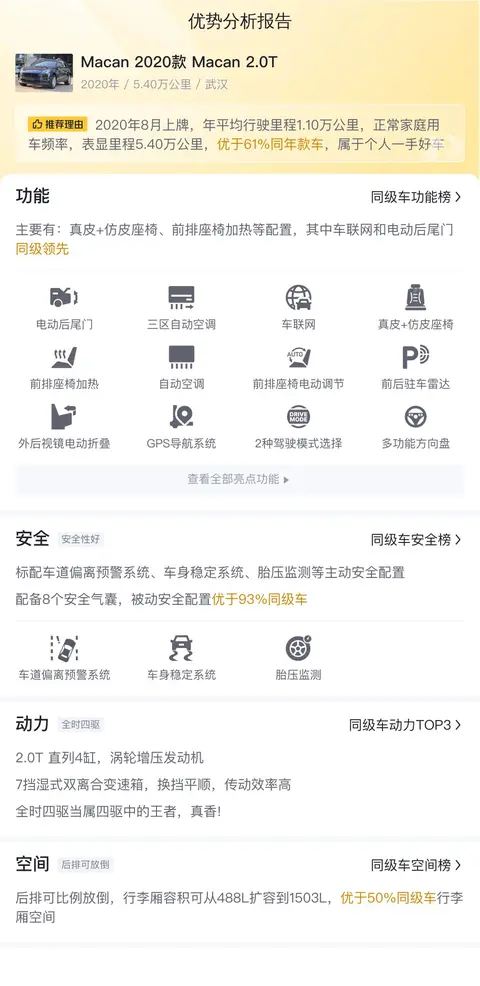 据估算,Macan 2020款 Macan 2.0T的用车成本是15154元/年,而同级车最低是11469元/年,最高是19468元/年,所以它的用车成本也合理。