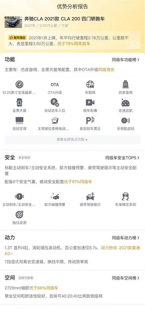咱们买车,肯定也得看看市场行情,做到心里有数,咱们这辆奔驰CLA 2021款 CLA 200 四门轿跑车在全国有50多辆同款车型在售,售价在14.6万-18.97万之间,本车售价14.4万,是所有同款在售车型中价格最低的一款,从价格上看,本车还是具有很高的购买价值的。