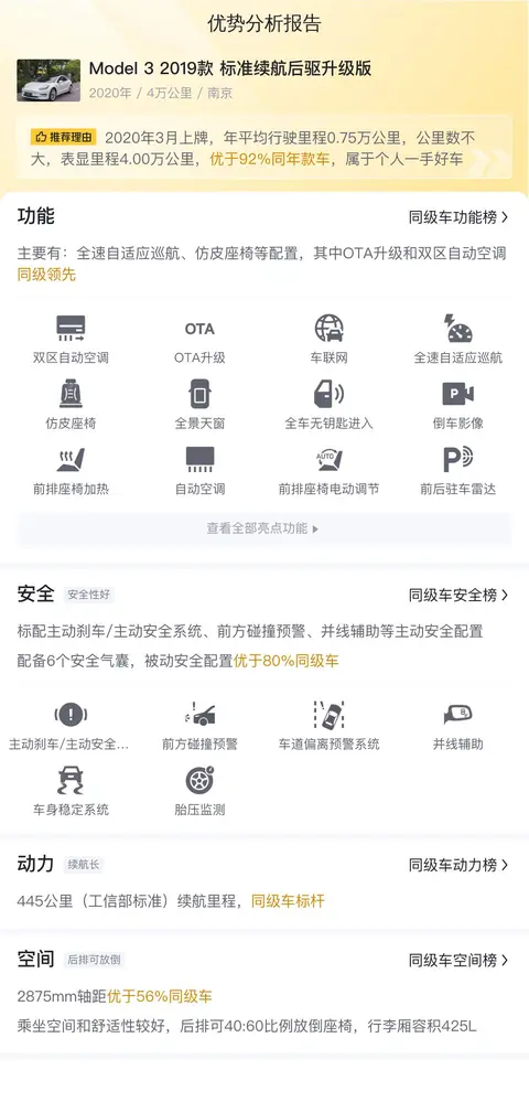 报价低于市场行情,Model 3 2019款 标准续航后驱升级版的市场行情价是11.92万-14.62万,它的报价则是11.68万,价格上有很大优势,同时保值率也较高。