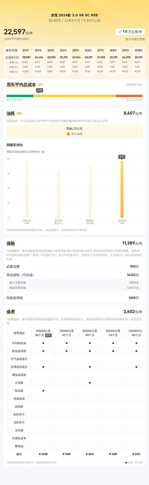 根据懂车帝对发现2014款3.0 V6 SC HSE的分析,这辆车的10年平均用车成本为23445元/年,与同级车相比处于适中的水平。其中,油耗成本为11653元/年,保险费用约为9144元/年,保养成本则为1044元/年。这些成本的具体金额可能会因个人驾驶习惯、使用频率以及地区差异等因素而有所变化。