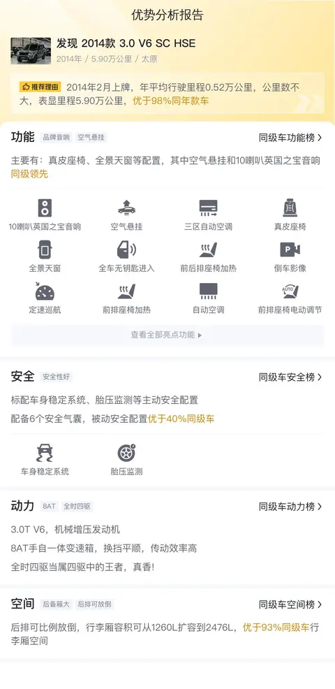 综上所述,这辆二手发现2014款3.0 V6 SC HSE在各个方面都展现出了不俗的实力。无论是从车况、配置、动力、空间还是市场行情等方面来看,这辆车都具有较高的性价比和竞争力。如果您正在寻找一款性能出色、配置丰富且价格合理的二手豪华中大型SUV,那么这辆发现无疑是一个值得考虑的选择。但是,这辆车目前还没有检测报告,喜欢的话,可以去实地详细了解一下。