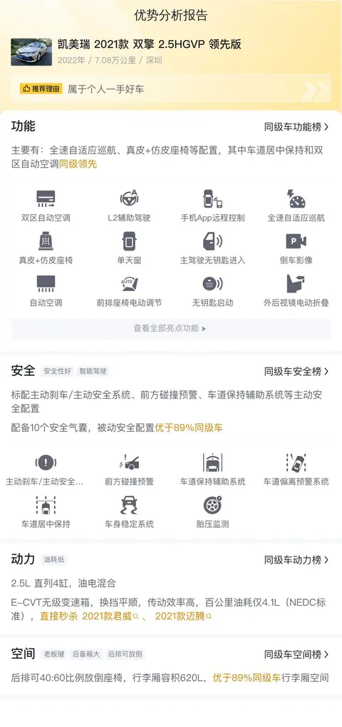 缺点:从动力上看,凯美瑞 2021款 双擎 2.5HGVP 领先版并不优秀,只是够用。而且混动车型后期保养费用略高,需要考虑后期成本。