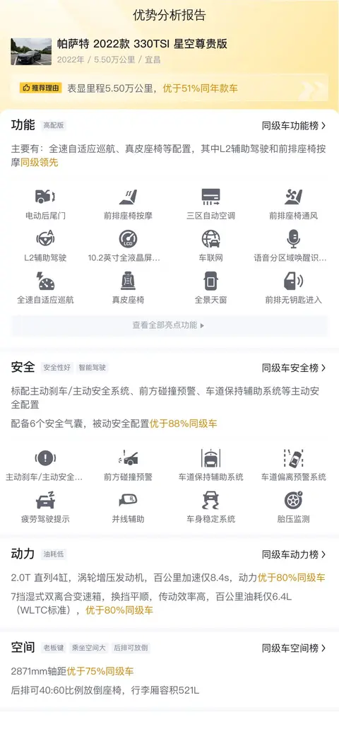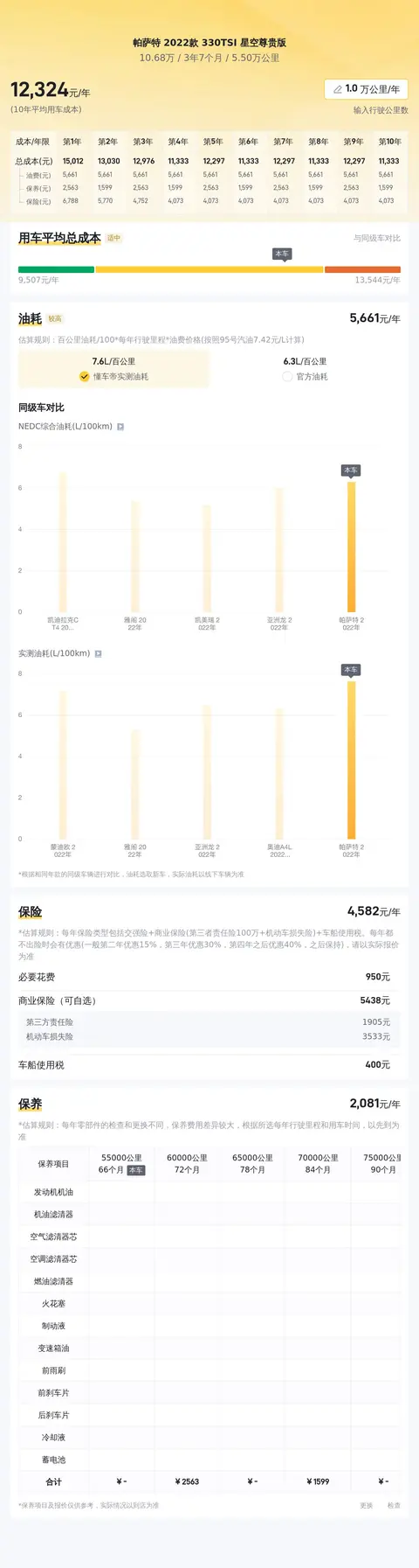 帕萨特 2022款 330TSI 星空尊贵版的10年平均用车成本是12180元/年,同级车的最低是10801元/年,最高是13723元/年,所以它的用车成本合理。