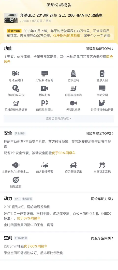综上所述,这辆二手奔驰GLC 2018款 改款 GLC 260 4MATIC 动感型是一款车况良好、性价比高的豪华SUV。它在外观、性能、舒适度等方面都有出色表现,且维护成本适中。然而,购买者也需要注意其较高的维护成本和油耗问题。总的来说,如果您正在寻找一辆性价比高、车况良好的豪华SUV,那么这辆车绝对是一个不错的选择!
