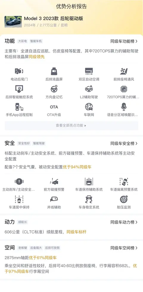 优势:作为全球知名的电动汽车品牌,特斯拉在电池技术和自动驾驶方面积累了大量的专利和技术。反应在产品上就是比较高的品牌价值和市场认可度。此外这款Model 3 2023款 后轮驱动版的配置也比较丰富,配备的车道保持辅助和车道偏离预警系统极大程度的发挥了辅助驾驶的作用,减轻驾驶压力。而且纯电续航也不错,动力强劲,用车成本也比较低。
