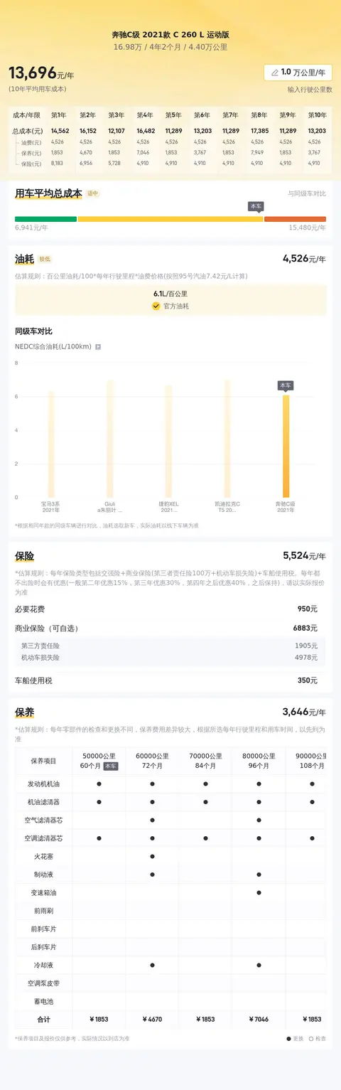 同时,根据估算,同级车的最低用车成本是6506元/年,最高是16874元/年,奔驰C级 2021款 C 260 L 运动版是13556元/年,所以不算低。