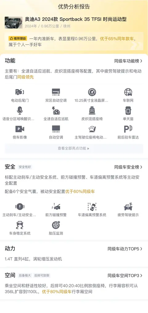 这辆奥迪A3 2024款 Sportback 35 TFSI 时尚运动型配备了全速自适应巡航、10.25英寸全液晶屏仪表、8.8英寸中控屏、皮织混搭座椅等配置,其中疲劳驾驶提示和电动后尾门触控式设计同级领先。在安全方面,该车标配疲劳驾驶提示、车身稳定系统、胎压监测等主动安全配置,配备6个安全气囊,被动安全配置优于90%同级车。