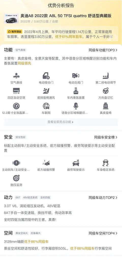 奥迪A8 2022款 A8L 50 TFSI quattro 舒适型典藏版是一款集豪华与性能于一身的旗舰级轿车,它在多个方面展现了显著的优势。首先,奥迪A8L搭载了3.0T涡轮增压V6发动机与48V轻混系统,这一动力组合不仅提供了出色的动力输出,还在燃油经济性方面表现出色,符合现代消费者对高性能与低能耗的双重需求。其次,奥迪A8L注重驾驶安全,配备了智能驾驶辅助系统,包括自适应巡航控制、车道保持辅助等功能,这些技术的应用有效提升了驾驶的安全性与舒适性,让驾驶者在享受驾驶乐趣的同时,也能感受到科技带来的安心。再次,奥迪A8L拥有较大的内部空间与505L的行李舱容积,这一设计不仅满足了商务人士的需求,也适合家庭使用,无论是长途旅行还是日常出行,都能提供足够的储物空间与舒适的乘坐环境。最后,奥迪A8L 50 TFSI quattro 舒适型典藏版还具备较高的保值率,这意味着即使在车辆使用一段时间后,其剩余价值仍然相对较高,这对于车主来说是一种长期的经济效益。综上所述,奥迪A8 2022款 A8L 50 TFSI quattro 舒适型典藏版在动力性能、驾驶安全、内部空间与保值能力等方面均展现出显著优势,是一款值得推荐的豪华轿车。