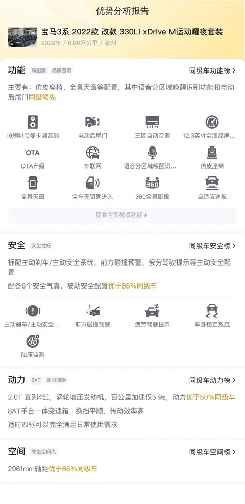 先介绍一下这台车的基本情况,该车具体版本是宝马3系 2022款 改款 330Li xDrive M运动曜夜套装,外观为黑色,上牌地为泉州,表显里程6.6万公里,2022年9月首次上牌,有1次过户记录。新车指导价为40.99万元,而现在的二手车报价为22.88万元,相比新车含税价打了个5折。