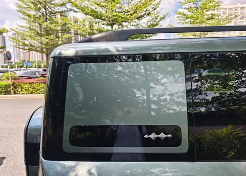 方程豹钛7整体造型较为方正,侧面还进行了内凹处理,应用了车身同色轮眉、方形外后视镜、固定式侧踏以及常规造型门把手,后排车窗配备隐私玻璃,D柱位置配备车身同色饰板搭配黑色饰条,还提供有方程豹品牌标识。