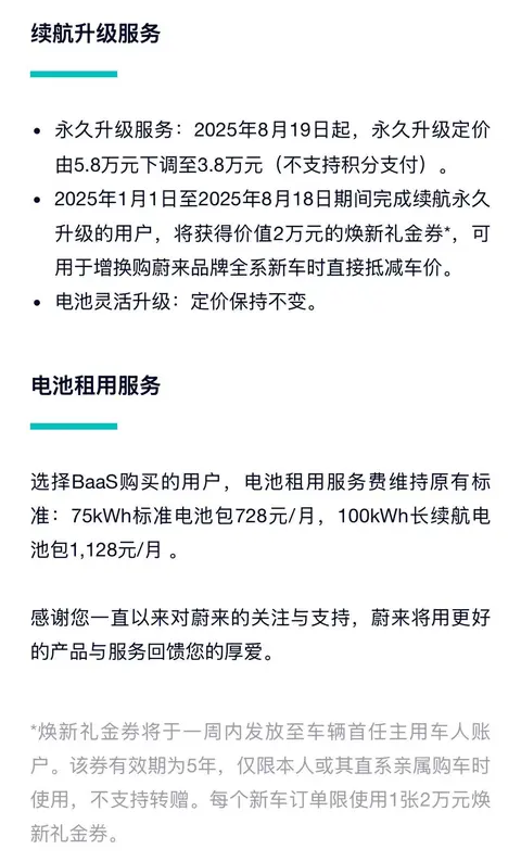 据了解,针对100千瓦时长续航电池包整车购买,未提车用户蔚来将按照调整后的价格安排交付。2025年1月1日至8月18日期间完成交付的用户,蔚来将发放价值2万元焕新礼金券,用户后期增换购蔚来品牌全新新车时直接抵减车价,但无法用于复购乐道、萤火虫品牌车辆。
