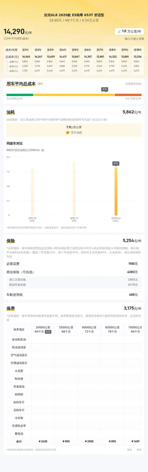 此外,用车成本也是每个车主必须考虑的问题。根据懂车帝大数据分析,别克GL8 2020款 ES陆尊 653T 舒适型的10年平均用车成本为14445元/年,而同级车的最低10年平均用车成本为13466元/年,最高10年平均用车成本为17683元/年,所以本车的用车成本适中。