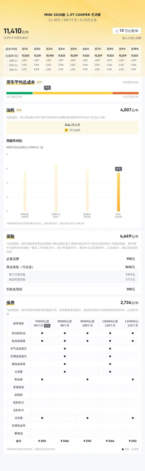 每年的用车成本,包括油费、保险费和保养费,大约得11283元。当然啦,如果您开车小心点,保险费用可能就没那么高;如果您的车需要大修,保养费用自然也会增加。所以,这些费用还是要根据具体情况来定的。
