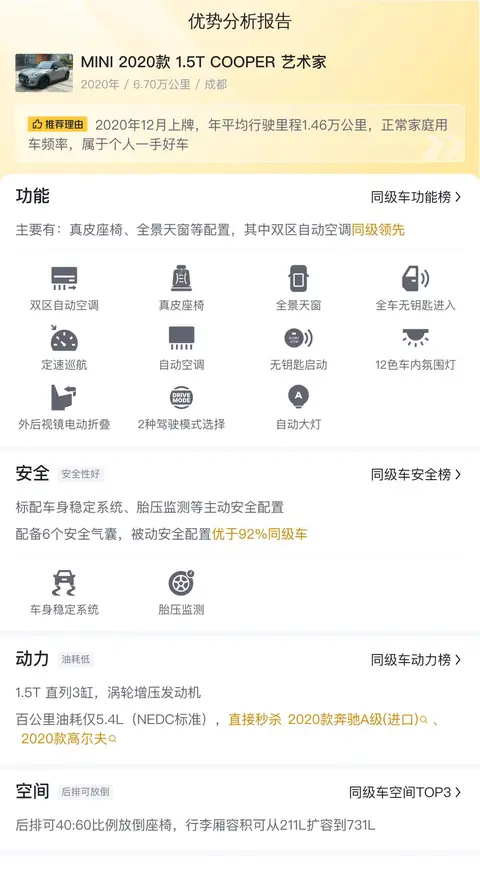 最后,再给您个秘密武器——优势分析报告,让您一眼看透这辆车的优点和缺点。