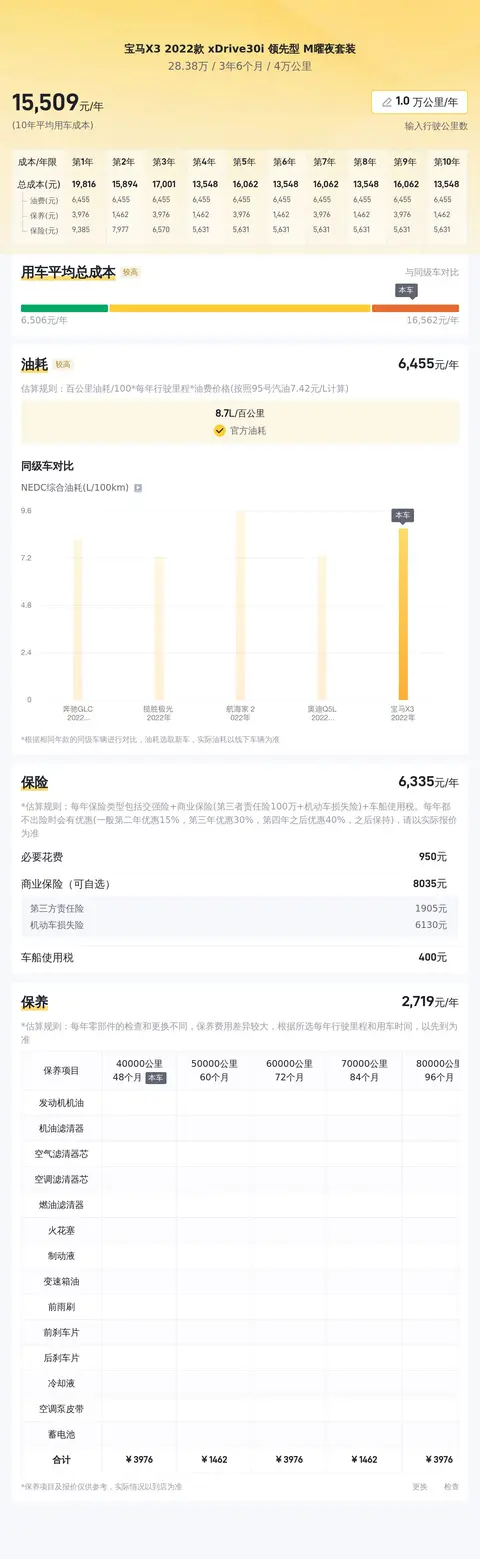 我们以每年行驶一万公里计算,包括保险、日常保养以及燃油费用等,平均每年的用车成本大约在1.6万元左右。当然,具体花费还需根据车主的实际使用情况和用车习惯来定。