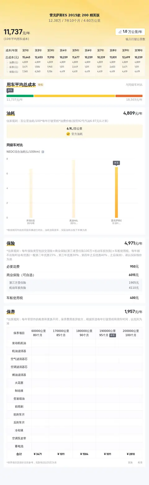 雷克萨斯ES同级车的最低10年平均用车成本是11469元/年,最高是17323元/年,雷克萨斯ES是12363元/年,用车成本较低。
