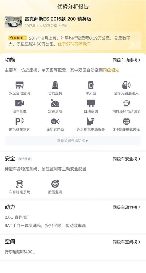 优势:雷克萨斯ES最大的优势就是价格便宜,只要12.38万,行驶里程只有4.6万公里,性价比很高。加上雷克萨斯ES属于热门车型,市场欢迎度高,保值率高。从检测报告来看,车况良好,配置方面也比较丰富,整体来看,还是挺不错的。