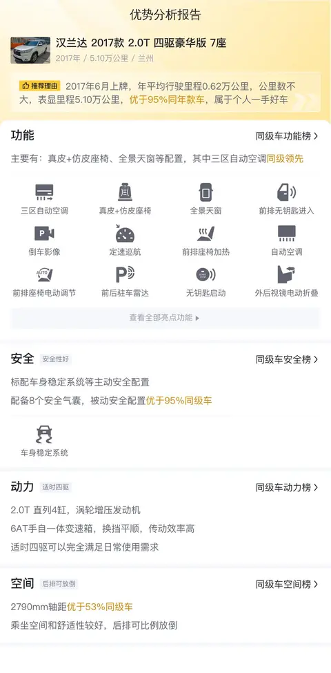 经过懂车帝大数据分析后,这辆汉兰达 2017款 2.0T 四驱豪华版 7座车型的10年平均用车成本约为12179元/年,这一数据不仅低于同级别车型,更远低于同价位区间车型,对于家用而言,用车成本远比购车成本来的更重要,更持久。